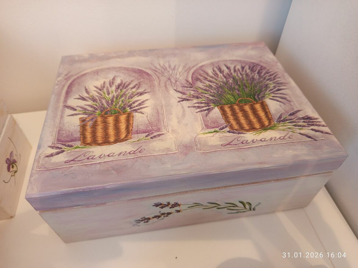 Drewniana skrzynka ozdobiona techniką decoupage. Wymiary 24*18, wysokość 9 cm. Nowa. Jedyna w swoim rodzaju. Wzór lawendy. Odbiór osobisty w okolicach Czosnowa lub Łomianki w dni powszednie.Sprawdź zainteresowanie tym ogłoszeniem